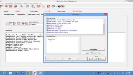 Over and above the main tool bar on the top of the window, extra tools are provided on the additional tool bar in the middle line of case record window, for various operations like editing patient details, opening case recording form, opening reference tray, opening existing work sheet, opening rubric basket, Quick Pick Tool, Recombinant Method, open Repertories, search Repertories, open drop-down list of consultations, backward-forward navigation buttons, open Case Hisory, open Drug List, Print Options, Save, Delete etc.